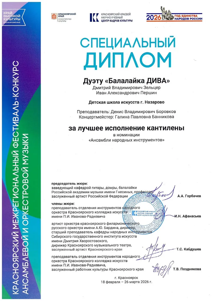 Нашу школу достойно представил Дуэт "Балалайка ДИВА" Першин Иван и Зельцер Дмитрий, которые стали обладателями специального диплома и благодарственного письма II тура!