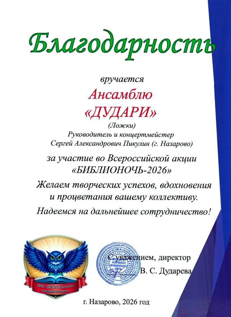 В рамках ежегодной всероссийской акции «Библионочь» ансамбль «Дудари» под руководством и при участии концертмейстера Сергея Александровича Пикулина подарил зрителям незабываемое выступление.
